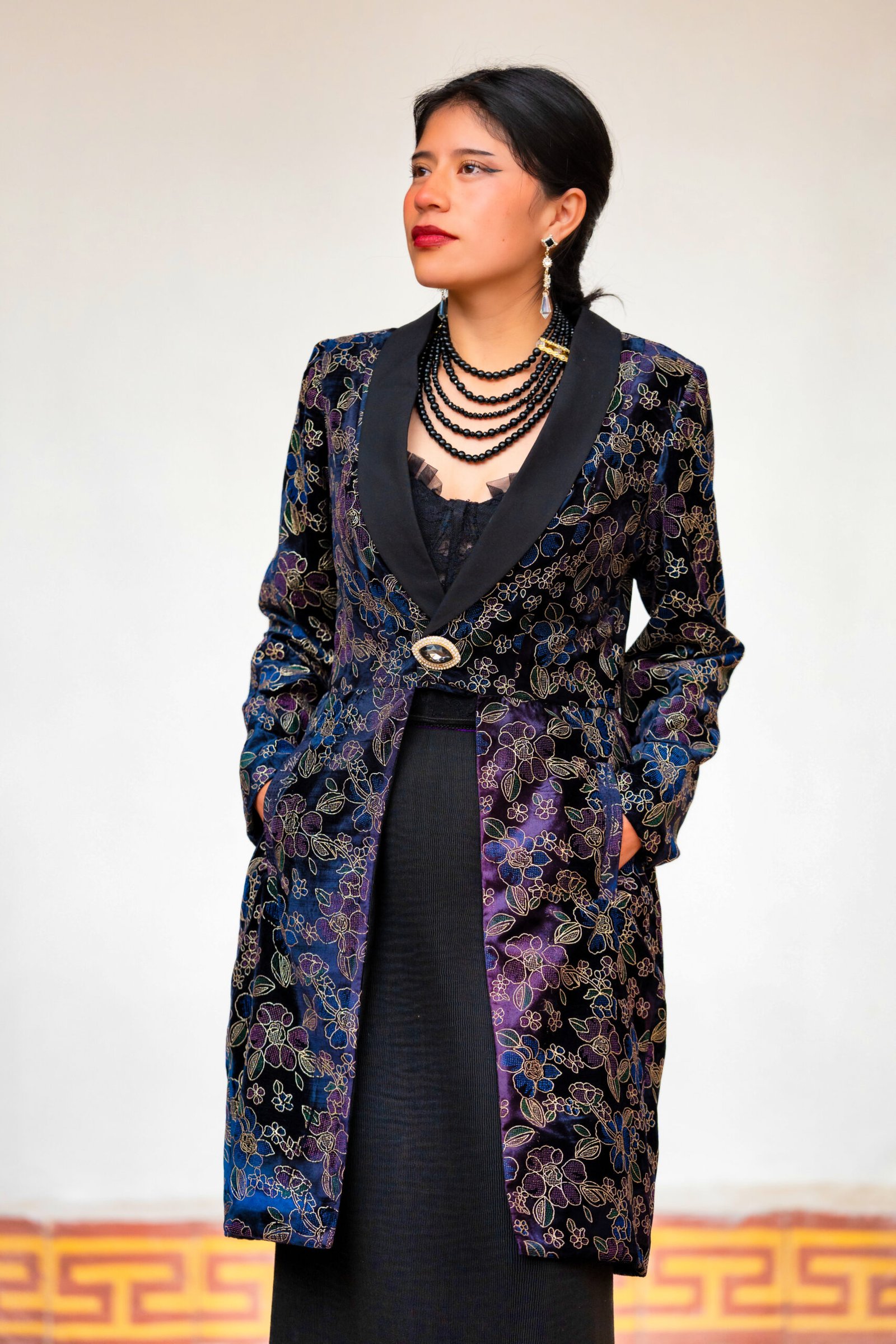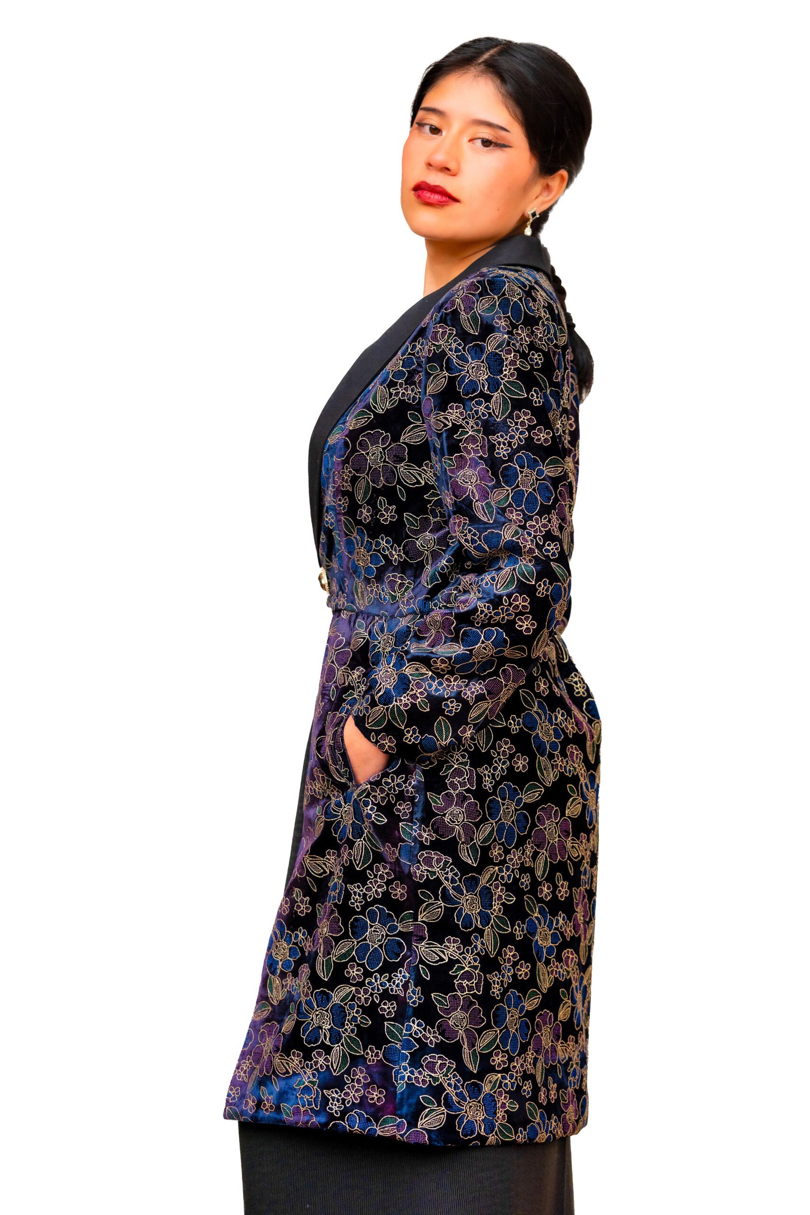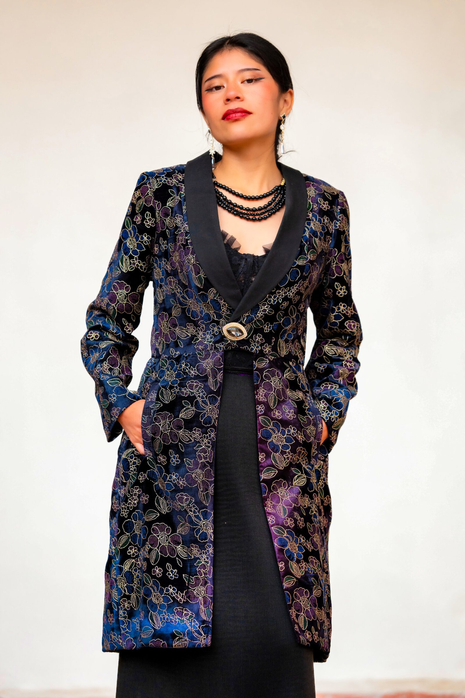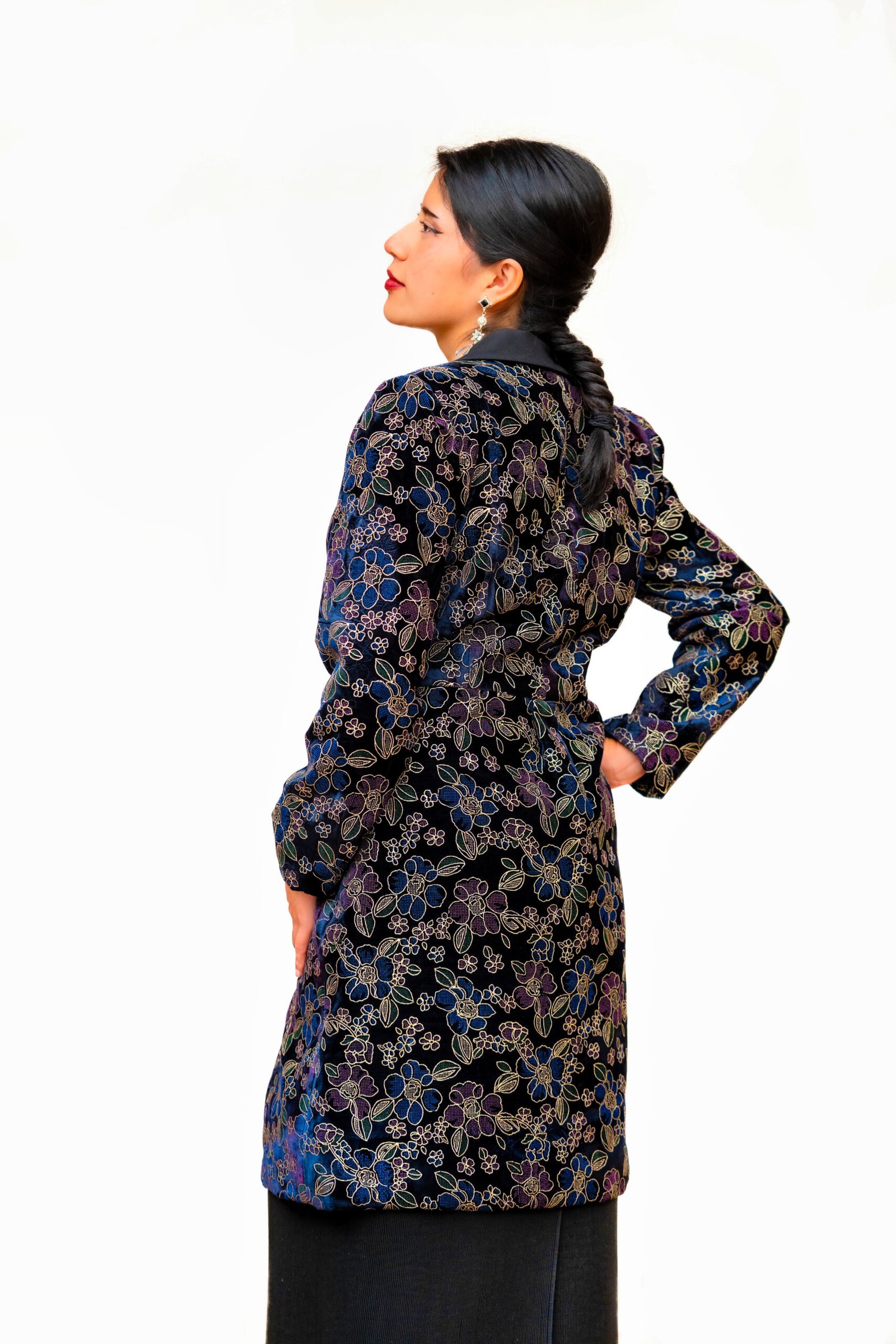 Abrigo largo en terciopelo brocado, con motivos florales