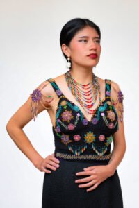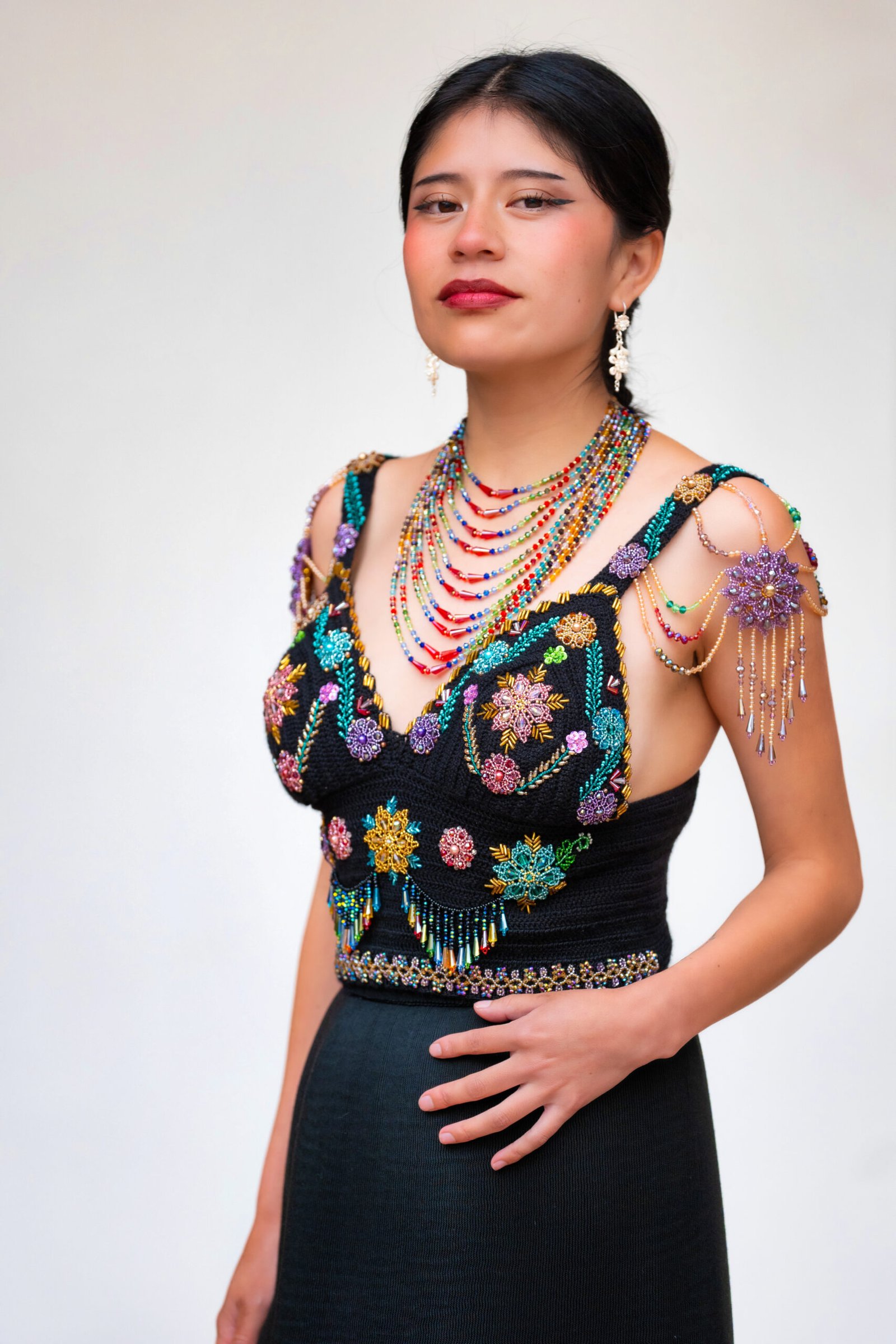 Corset tejido a crochet, con aplicaciones de pedreria tejido a mano.