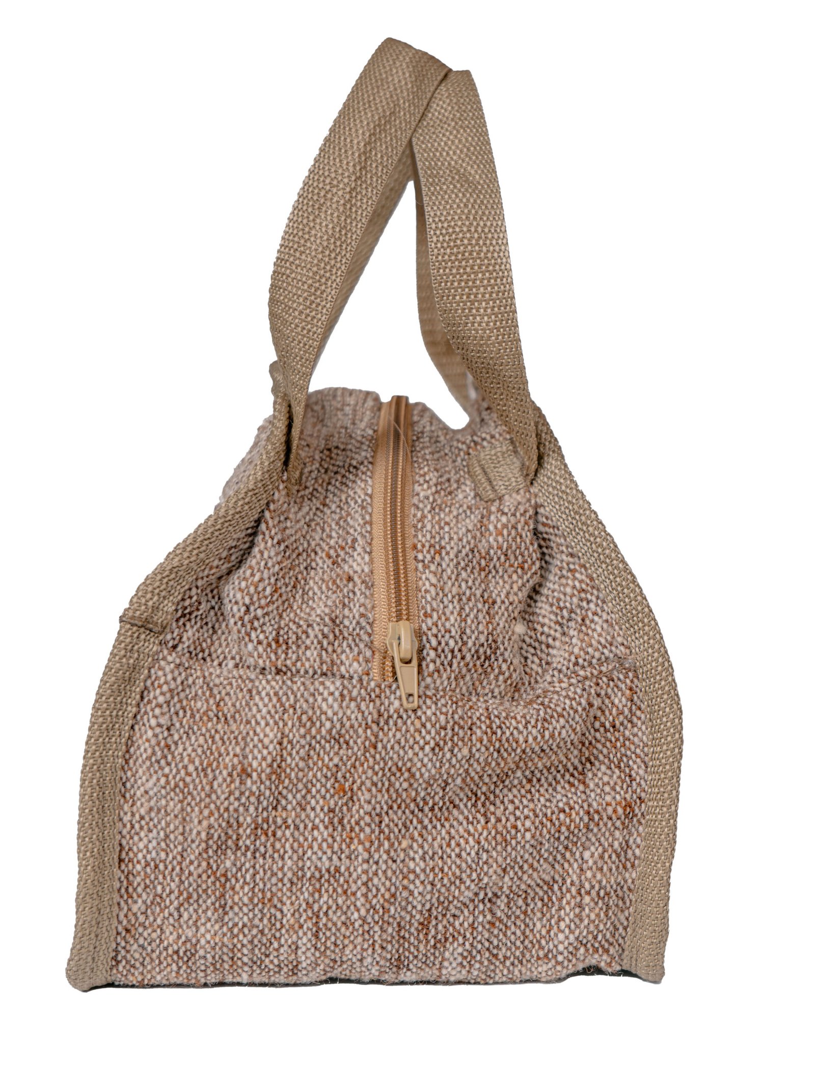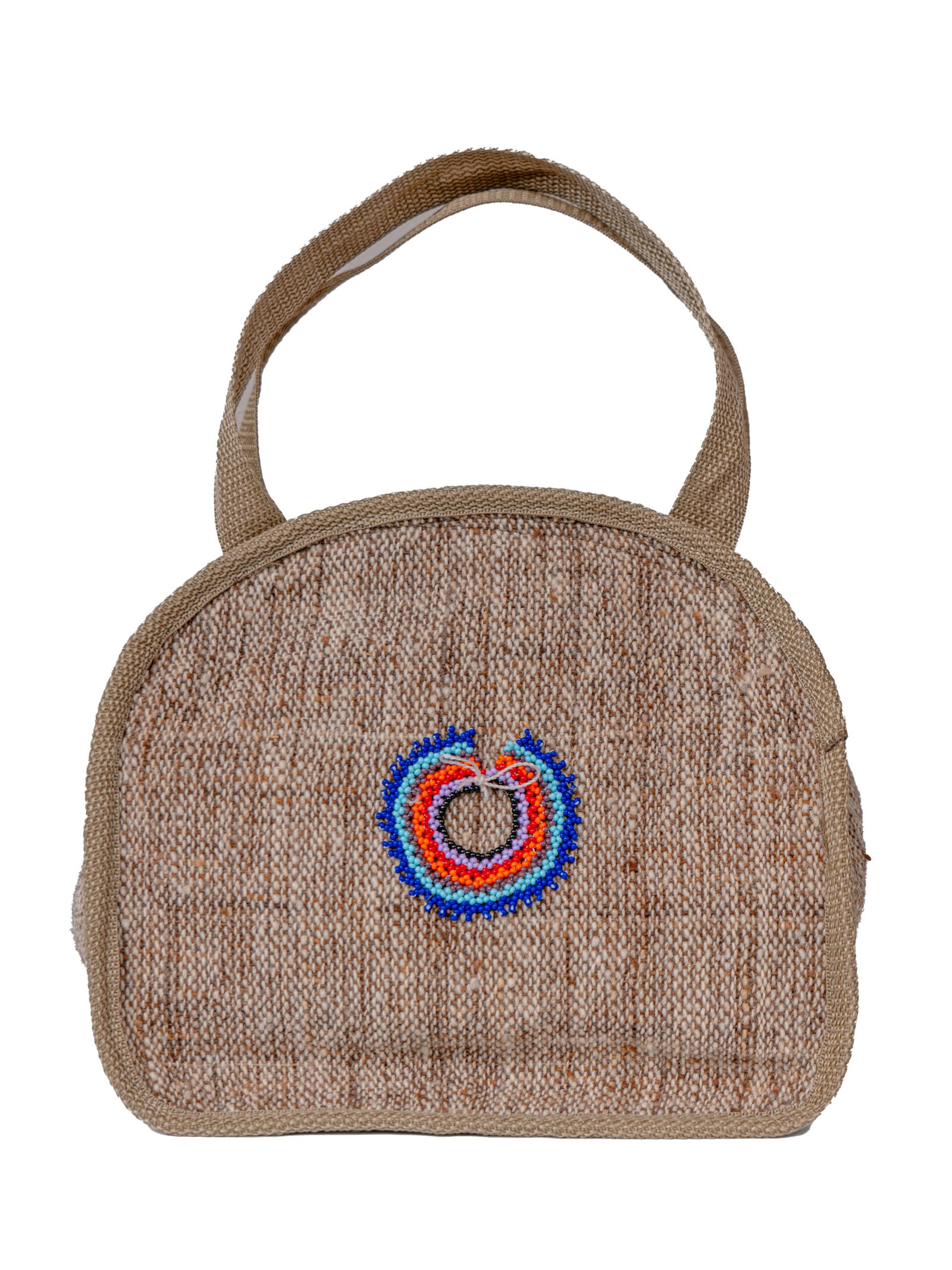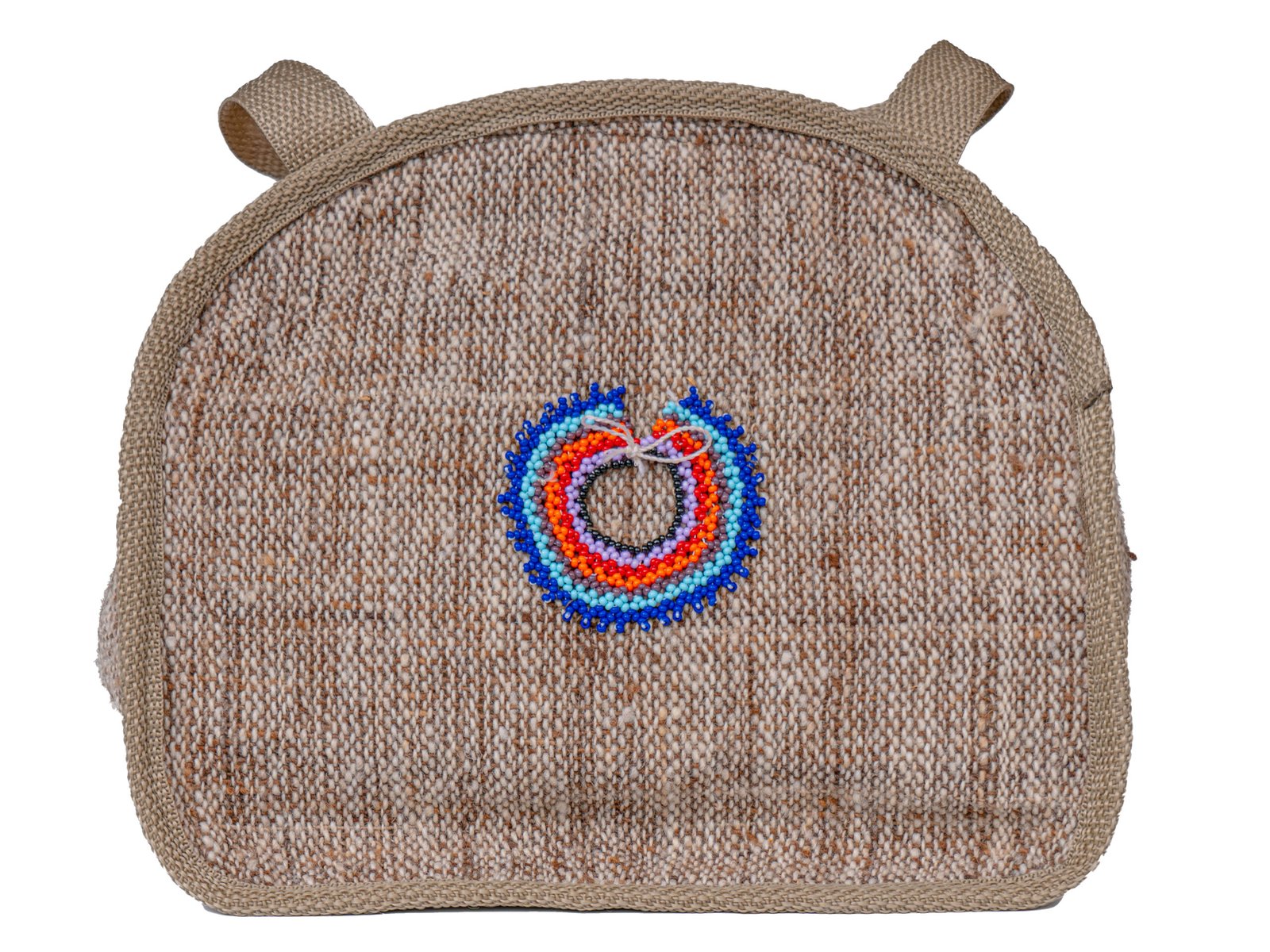 Cartera tejida en telar pequeño con lana de oveja, teñida con pigmentos naturales. Incluye un delicado collar de mullos que realza su esencia ancestral, elaborada a mano por Carmen Guamán artesana de la comunidad de Ñamarín.
